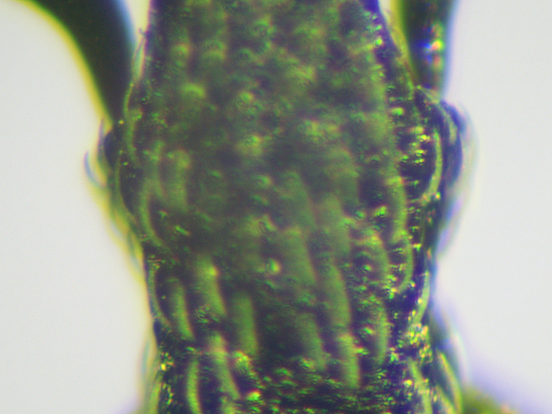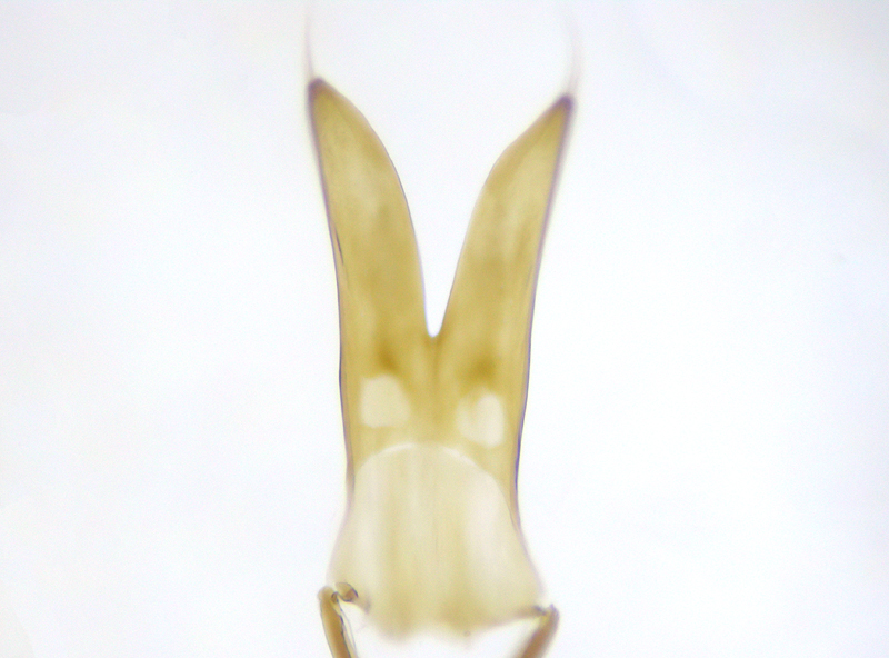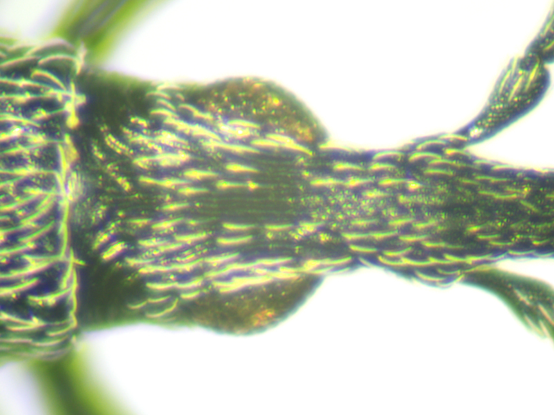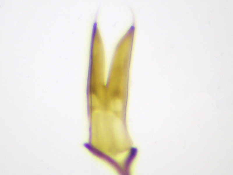 However, there were two problems with calling it carduorum. Firstly it was a touch under 2.6mm long, whereas the bottom end of the size range for carduorum given in both keys is 2.7mm. Close enough maybe? Secondly Duff describes the elytra as "bright metallic blue", whereas gibbirostre can be blue or green. This was clearly green - bluish green maybe, but more green than blue. This seemed less of a problem when I looked at photos of carduorum online - they all seemed pretty green to me, although not as green as mine. So, though I retained a niggling doubt, the shape of the rostral swelling seemed pretty unambiguously round, it surely had to be carduorum. To remove the niggling doubts I decided to check the genitalia. Duff doesn't show the genitalia and Hackston only uses genitalia to compare onopordi to the other species, not do differentiate between the other species whose genitalia aren't illustrated. But there are photos of gibbirostre genitalia at coleonet.de and the Weevils of Greece website. The latter also has genitalia photos for the non-UK Ceratapion damryi but I cannot find any photos of carduorum genitalia. Still, if the genitalia were clearly different from gibbirostre, that would probably be sufficient to convince me it was carduorum. Well, looking at the Weevils of Greece website first, it was different - the V incision of the tegmen diverged more widely near the point of the incision, and the inner sclerite seemed narrower with fewer teeth along its side. The latter difference was less convincing when I looked at the coleonet.de photos but the V still looked wider at the incision. However I then set the genitalia on a microscope slide and as I compressed the tegmen slightly while putting the cover slip on, it splayed out so that it now looked much more like the photo at the Weevils of Greece site.