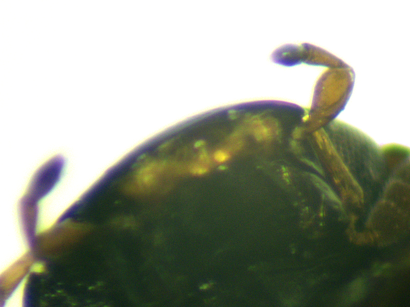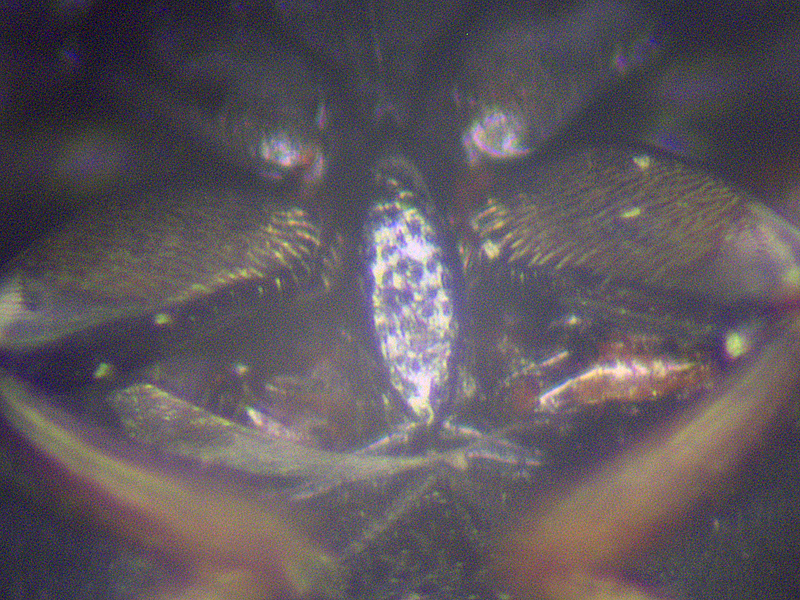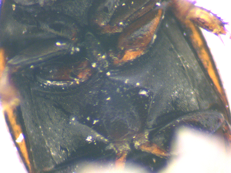 This one keyed to marinus using Duff fairly smoothly. The yellow on the elytra appeared to stop well short of the humeri looking from above but when viewed from the side you could see it extending further forwards. Checking against Hackston I hit a dead-end - the problem seemed to result from this key requiring the front angles (at least) of the pronotum to have a reddish patch whereas on mine the proonotum was completely black. My photo of the hind angles of the pronotum does appear to show a slight reddish reflection at the front margin of the pronotum near the front angle, but even after noticing this in the photo I could not find any angle to hold the beetle at where I could see this under the microscope. My previous example above did have such a reddish spot and so do most examples I can find online, but the extent seems to be variable and as Duff doesn't mention it I'm hoping it can be missing altogether. This beetle was 2.6mm long.