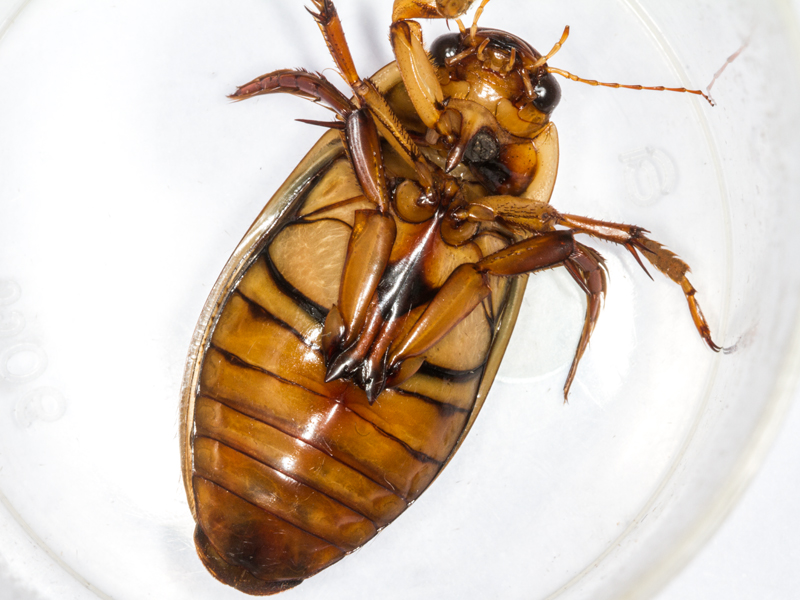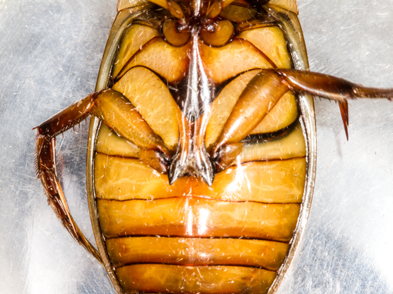 male Great Diving Beetle Dytiscus marginalis showing pro-tarsus and hind coxal processes, North Elmham (Norfolk, UK), 8th May 2018