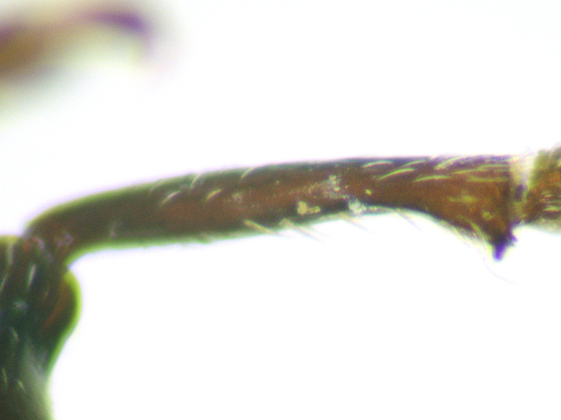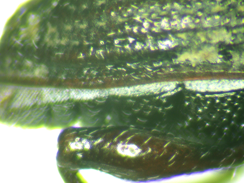 Notaris acridulus showing rear side of elytron, rostrum from side, fore tibia and pronotum, North Elmham (Norfolk, UK), 14th October 2017