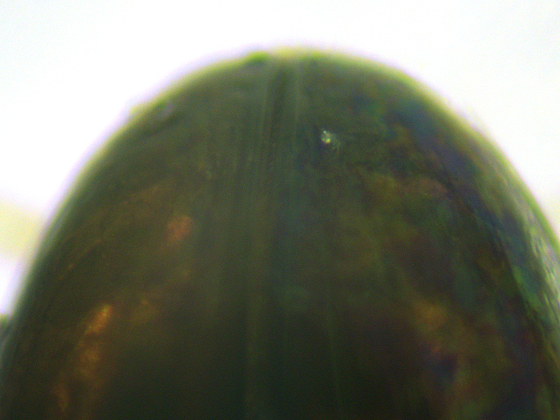 male Olibrus affinis showing its elytra (twoards the apex, suture side), aedeagus (side view and flat, latter with internal part to left), North Elmham Cathedral Meadows (Norfolk, UK), 4th June 2021