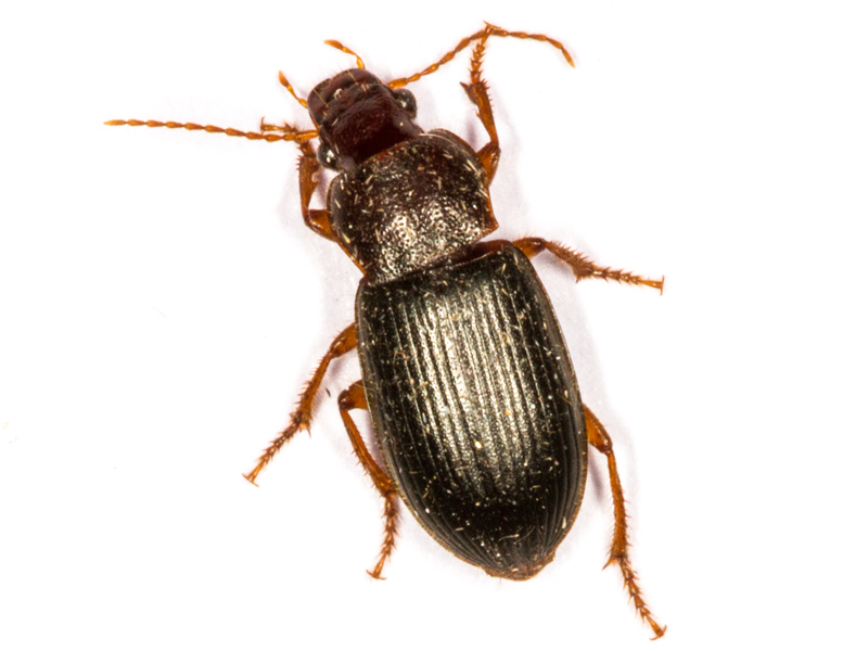 female Ophonus rufibarbis (?) showing side of pronotum and centre of elytra, North Elmham (Norfolk, UK), 17th June 2022