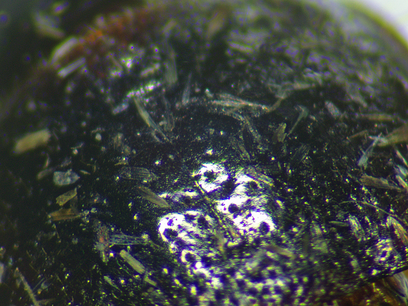 - Number of rows of punctures on the inner elytral intervals: according to Duff rufibarbis has two or three rows whereas on schaubergerianus the intervals each mostly have four rows. This is similar in Hackston's key. The punctures aren't arranged in particularly tidy rows so this isn't always easy to assess, but on the first individual below there were clearly only 3 punctures in a loose row in some places, but clearly 4 in some places, and even 5 sometimes. There's a high quality image of rufibarbis by Udo Schmidt at Flickr. The puncturing on the 4th interval outwards is easiest to see and there are clearly 4-5 punctures wide in places here, but does the 4th interval count as one of the "inner intervals"? Probably not, but that begs the question, what exactly do Duff and Hackston mean by the "inner intervals". Could they be specifically referring to the one and only one innermost interval on each elytron, i.e. the one adjacent to the suture, or do they mean any of the intervals that are relatively close to the suture, i.e. including the second and perhaps the third intervals at least. I think the latter is a better understanding of the words used, at least as I understand the English language - it's the difference between inner and innermost. The innermost intervals are the two adjacent to the suture, and the inner intervals include at least 1-2 of the next intervals out. But if the authors are referring only to the innermost intervals then this makes a big difference, and whether it's what they meant or not, based on the images I can find of the two species online I think it perhaps should be what they meant. Udo Schmidt's photo does show only 3 punctures in rows on the innermost interval, at least for most of the length. And the best quality photos I can find of schaubergerianus do seem to show 4 punctures on this innermost interval. So I think maybe the innermost interval is the only one that really matters here, not any of the other intervals that might be included within a undefined description of inner intervals. As with the puncturing on the pronotal disc, if these are in fact neither rufibarbis or schaubergerianus, then this might again explain why I am struggling with this feature too!
