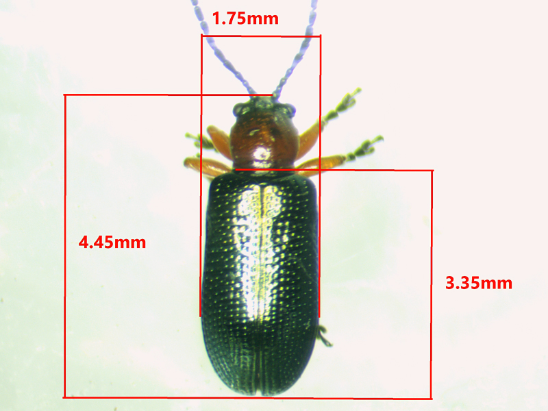female Oulema melanopus showing antenna (segment 5 in middle), elytral measurements and spermatheca, Wendling Beck Project (Norfolk, UK), 4th July 2025