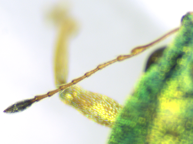 Polydrusus formosus showing rostrum from above and side, antenna, head from above, fore femur and elytral scales, Wendling Beck Environment Project (Norfolk, UK), 27th May 2025