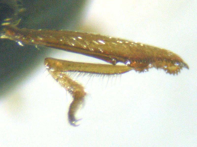 female Cabbage-stem Flea Beetle Psylliodes chrysocephala showing hind tibia and spermatheca, North Elmham Cathedral Meadows (Norfolk, UK), 17th September 2021