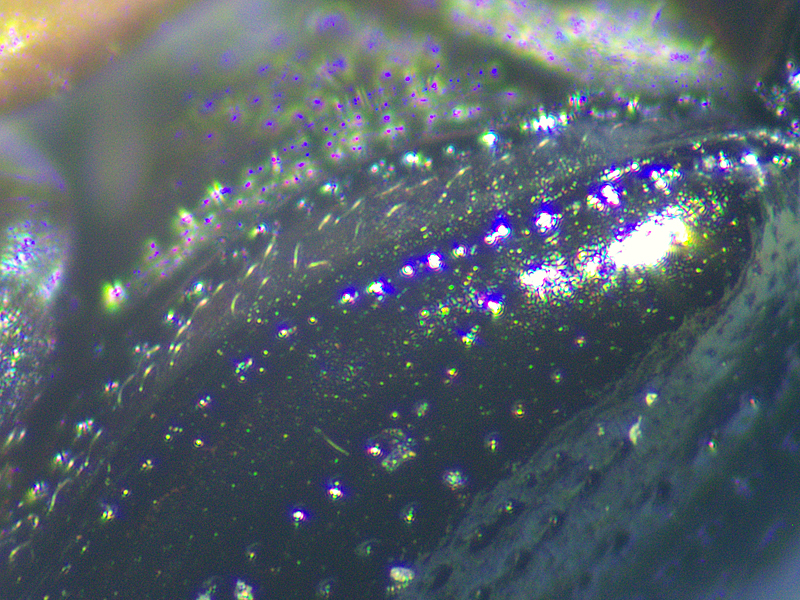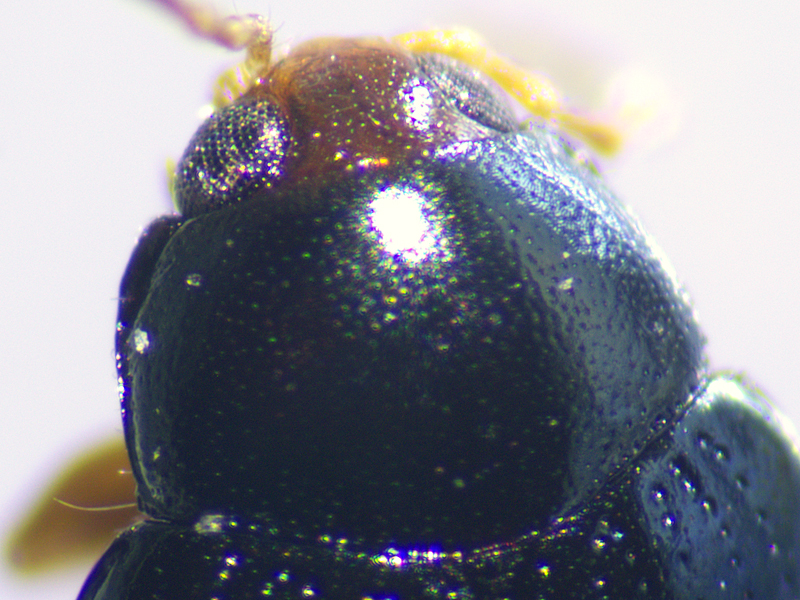 Cabbage-stem Flea Beetle Psylliodes chrysocephala showing hind tarsus, pronotum and elytral epipleuron, North Elmham (Norfolk, UK), 19th March 2021