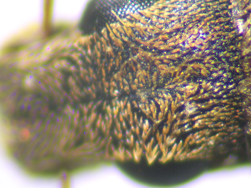 male Sitona obsoletus showing top of the head to show frontal groove, fore coxae and prosternum and elytral scales, Wendling Beck Environment Project (Norfolk, UK), 29th to 31st March 2024