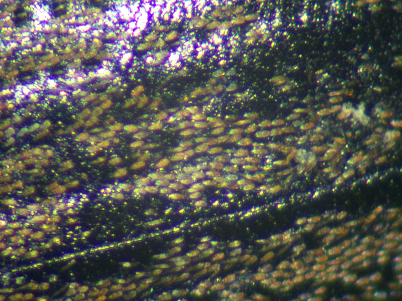 female Sitona obsoletus showing its fore coxae and prosternum, top of the head to show frontal groove, spermatheca, elytral scales and elytral punctures from below (upper edge in photo is the sutural side), North Elmham (Norfolk, UK), 30th December 2021
