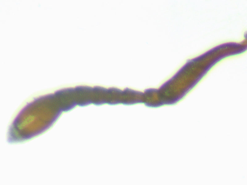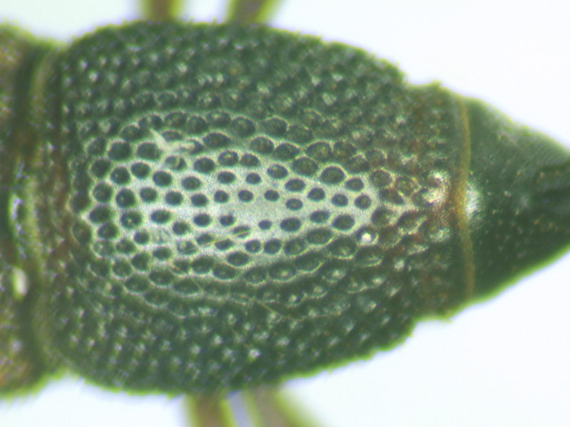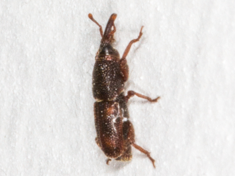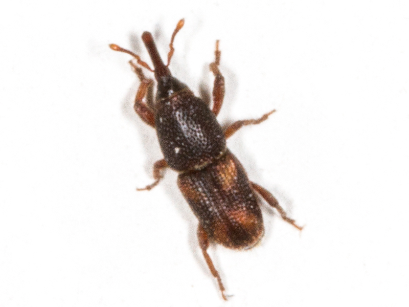 I found this indoors, in my bathroom. Duff's key separates this species from Maize Weevil Sitophilus zeamais (which I don't think has been recorded in Norfolk) by male genitalia and although the species notes suggest zeamais tends to be darker brown, more shining and with finer microsculpture on the upperparts, he says that only males are safely separable. Mike Hackston's key says that the pronotum of oryzae has "an indication of a median line which is either free of punctures or marked by two regular rows of punctures." On mine the central punctures are arranged more-or-less linearly so that there is a puncture-free line through the middle of the disc (not to the front and rear margins) which I guess is compatible with this? It also says the second segment of the flagellum should be scarcely longer than wide vs. 1.5x as long as broad on zeamais. I think mine is in between.