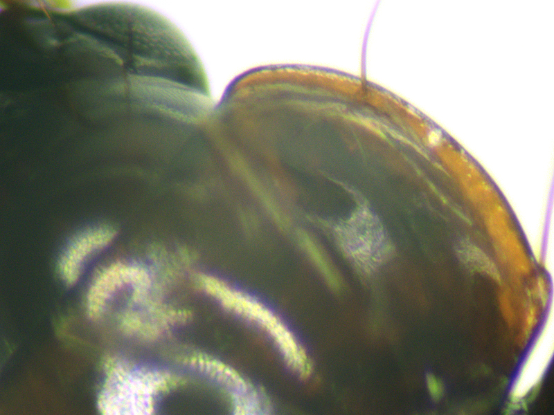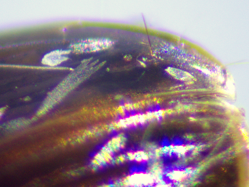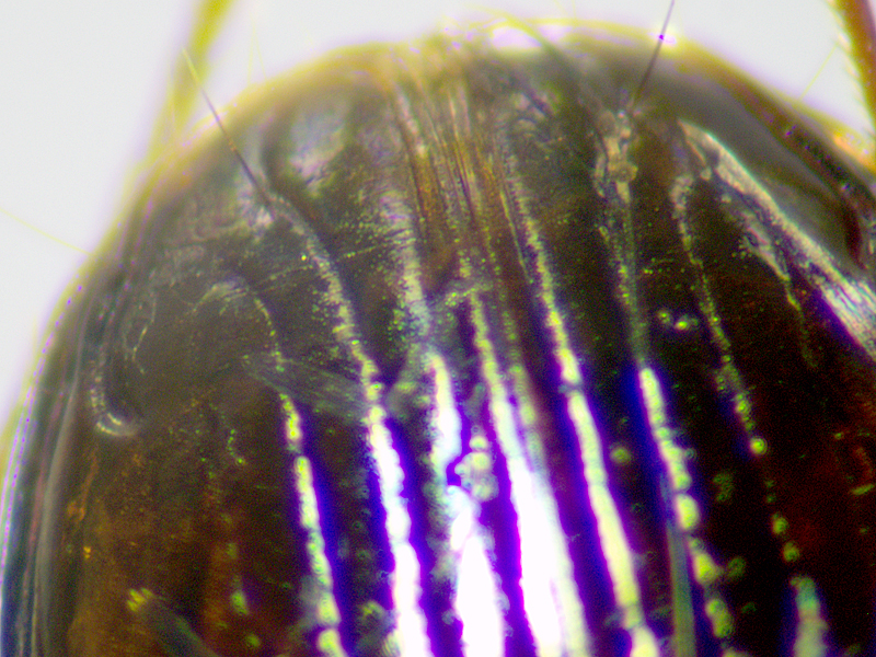 Trechus quadristriatus showing tip of elytra (3 angles), pronotum (2 angles) and mentum and palps, North Elmham (Norfolk, UK), 10th August 2023