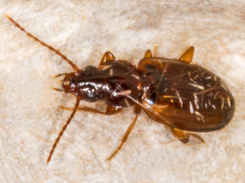 2x Trechus quadristriatus showing tip of elytra of first and position of rear bristle by eye of second, North Elmham (Norfolk, UK), 11th August 2023