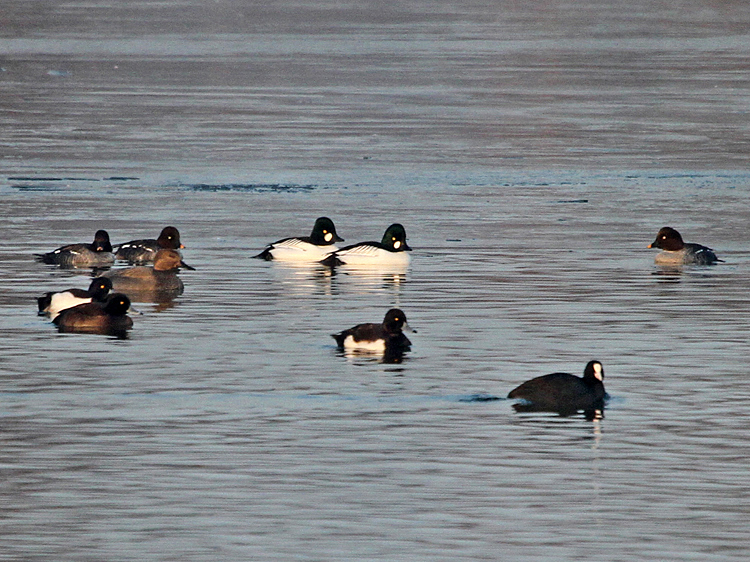 Common Goldeneyes (with Tufted Ducks and Eurasian Coot in the foreground), Nar Valley Fishery (Norfolk, UK), 23rd January 2017