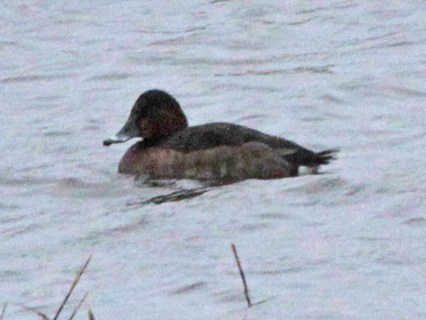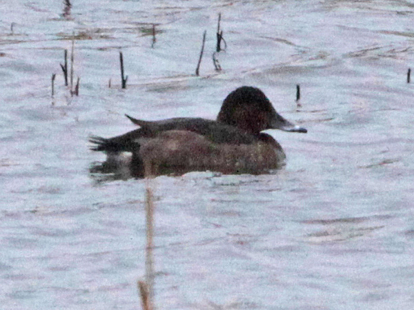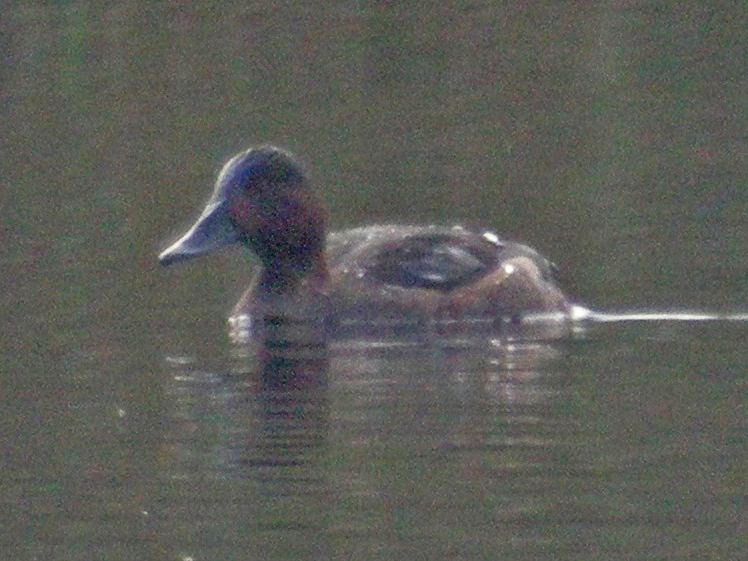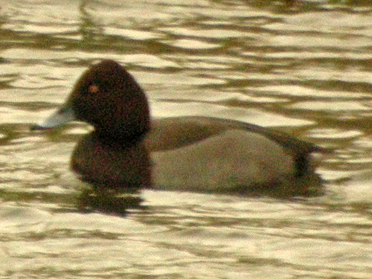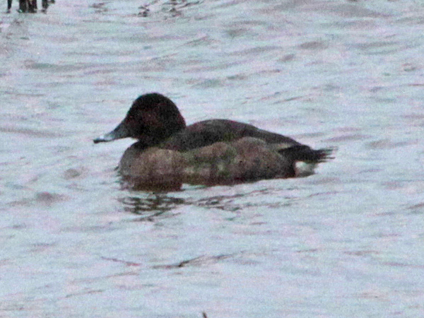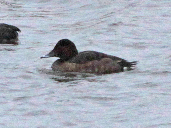 This was an unexpected find, a bird associating with Common Pochards and Tufted Ducks. The Ferruginous Duck influence wasn't immediately obvious to me in the field and I started off thinking it might be Common Pochard x Tufted Duck. Its dark brown colouration, not dissimilar to Tufted Duck and its lack of reddish tones to suggest Ferruginous Duck set me off in that direction. But female Common Pochard x Tufted Duck tends to look greyer on the body and to have an obvious pale patch at the base of the bill - or at least some of them do - so it warranted a closer look. The pure white under the tail separated from the brown flanks by a thick dark division was Ferruginous-like and although the head and bill profile mainly recalled Pochard, the head shape at times looked quite Ferruginous-like. And on closer inspection there was some ferruginous tones on the head, especially the face that was a touch paler and redder than the rest of the head. In flight it showed a paler, whiter wing-bar than the accompanying Pochards, but not as white overall as Tufted Duck. The shape of the wing-bar was like that of Pochard. Poor light meant I had to use a high ISO setting and the photos are grainy making the bird appear a little paler on the body than it really looked in life.