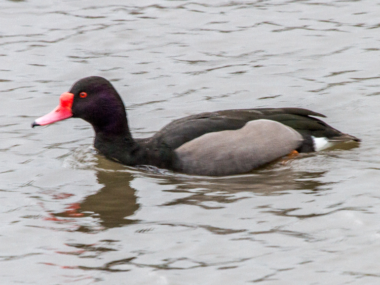I wasn't familiar with Rosy-billed Pochard when I took these photos and assumed that's what they were, but Joern subsequently pointed out that there are some anomalies for pure Rosy-billed Pochard. Most obviously the back is too pale, but I think the knob at the base of the bill is also a little subdued and there is perhaps a little too much black on the tip of the bill. I think the fact that the black at the rear of the flanks bleeds into the white vent is also indicative of it being a hybrid. Common Pochard seems the most likely second parent, supported by the appearance of the female (scroll down for more on that).