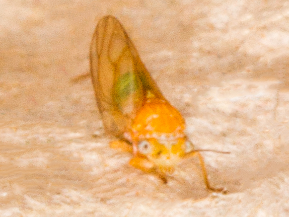 This came to light in my garden. It struck me as being quite different to the numerous Cacopsylla melanoneura which I have caught here previously, most obviously due to the very strong yellow suffusion on its forewings. I have observed some variation in the degree of suffusion (or lack thereof) on melanoneura but I have never caught one approaching this before. The entire insect seemed brighter and cleaner than is usual on melanoneura too, although there is much variation in melanoneura body colour and some certainly approach this (and nothing I've read suggests that colouration is helpful for separating these two species). Using the RES key, this keys straightforwardly and clearly to Cacopsylla affinis (or rather Psylla subferrugineus, the name that key uses for this species), and I suspect that this may well be the correct identification. However, other sources (including the British Bugs websitse and James Emerson's excellent NNNS guide to the Psyllids of Norfolk) state that melanoneura and affinis can only be reliably separated by male genitalia. Sadly this one was a female, so I guess that means that I cannot exclude the possibilty that it was an extreme melanoneura and therefore cannot record it as a certain affinis.