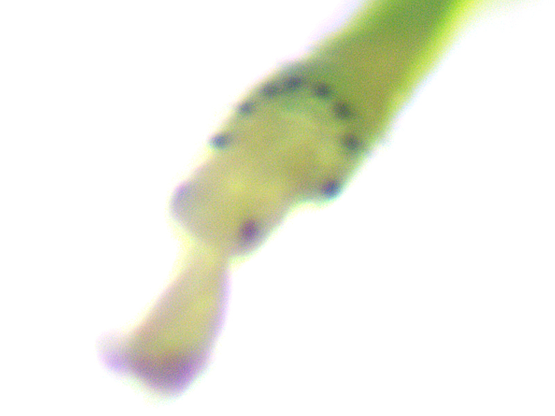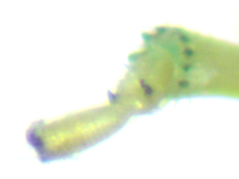 This didn't show 9-10 black metatibial spines so if I hadn't noticed its distinctive genitalia first I would probably have keyed it as a different genus. In fact it did have 7 spines which is one more than Psylla etc. should have. The photo of the spines below show all 7 spines (the left hand two overlap so they look like one) - there were no more hidden behind.
