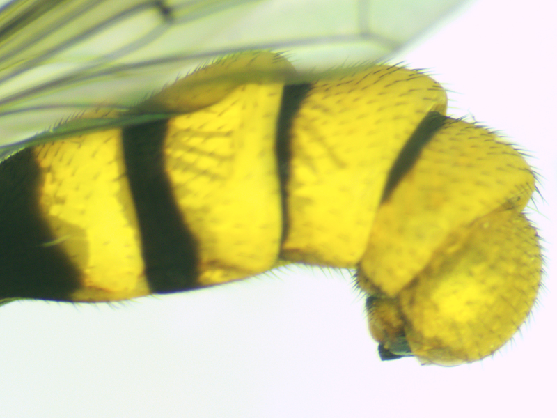 The pattern of the abdomen seemed to point towards signatus, but Steven Falk's photo of female signatus abdomen in side profile showed a much more prominent bulge on segment 5 where the theca is situated. Mike Hackston's key helped but without a diagram showing the theca I wasn't sure exactly which bit the theca was so I wasn't quite sure how to interpret it. Any doubt about the identity was finally laid to rest when I found the key in the Conopid Recording Scheme's newsletter number 6. This not only showed the abdomen from the side showing the theca not visible at all, but also postero-ventral views of both species showing the theca, and mine was a clear match to the diagrams for signatus. The theca was much easier to view after clearing the abdomen in potassium hyrdoxide solution.