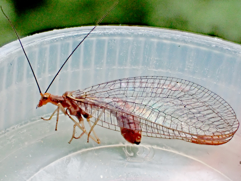 A very distinctive species, quite unlike anything else found in the UK. The term "green lacewing" hardly applies here, but neither does the vernacular name that I have occasionally seen attributed to this species, namely Black Lacewing. I suppose Brown Lacewing wouldn't do as it would invite confusion with the brown lacewings (family Hemerobiidae).