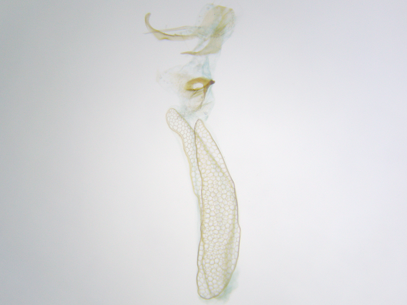 I first saw this species at Holkham in June 2016 when several were netted flying around Holm Oaks at dusk. As they were shown to me by someone else I didn't manage to get any photos. The following is the first adult I've identified since then, and was identified by examining the genitalia. My understanding (but I'm always willing to be corrected) is that the following in combination only occurs in heringella: 1) signa long, occupying nearly the whole of the corpus bursae, 2) signa wide, 8 reticulations across at the widest point, and 3) comparatively narrow margin to signa (cf. e.g. subbimaculella). The ductus seminalis is also supposed to be narrow but I'm not sure I can make that out. When I examined this I was also examining what I think was Broken-barred Oak Dot Ectoedemia subbimaculella, and the difference in thickness of the margin was striking. It's obviously difficult to measure such tiny distances but I made the margin of the subbimaculella signa somewhere in the region of 8μm and the margin of the heringella signa around 3μm.