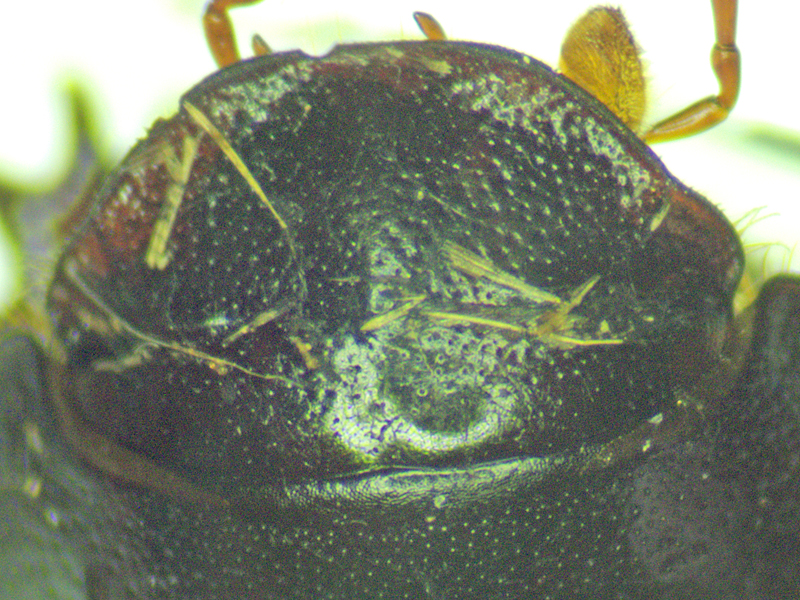 Bodilopsis rufa showing head, hind tibial ventral apical spines (both legs), scutellum and apex of elytron, North Elmham (Norfolk, UK), 14th August 2025