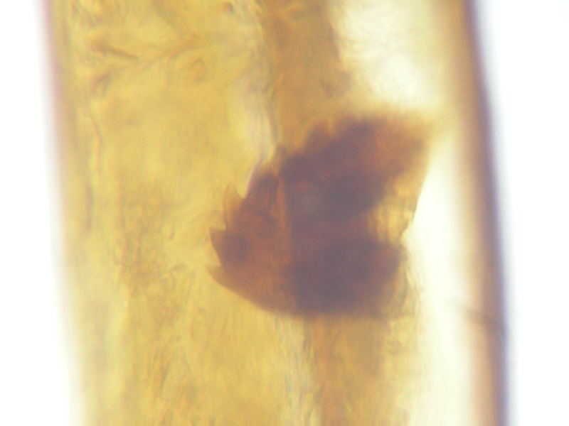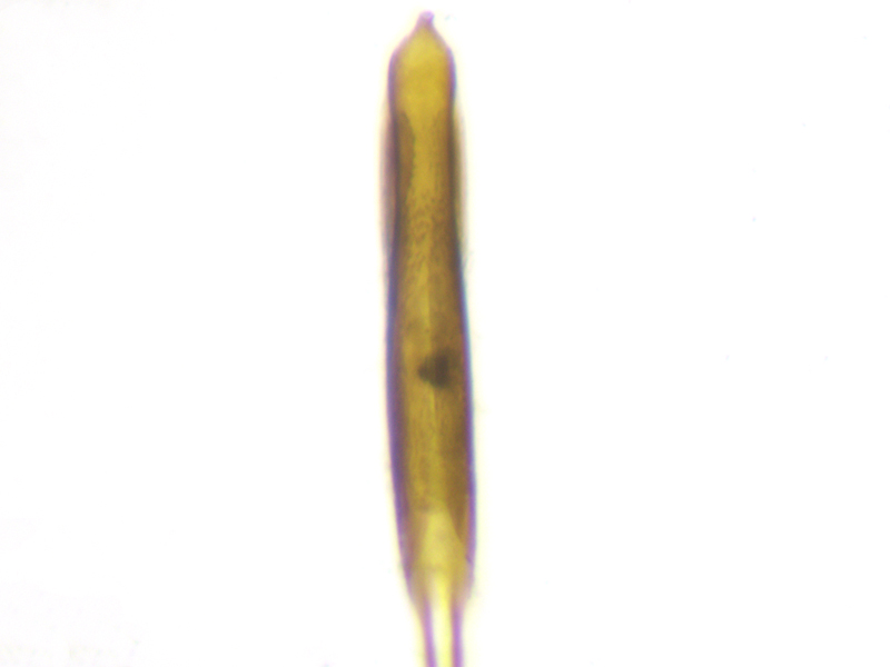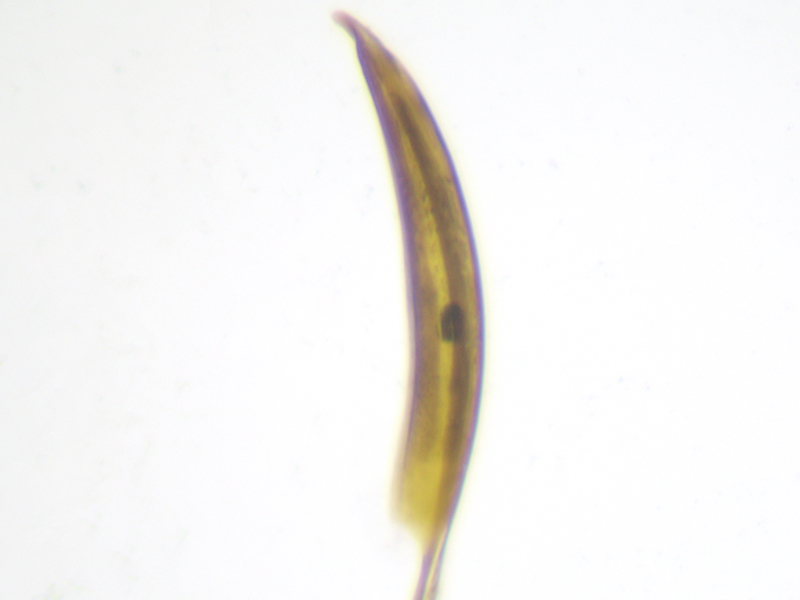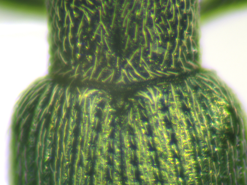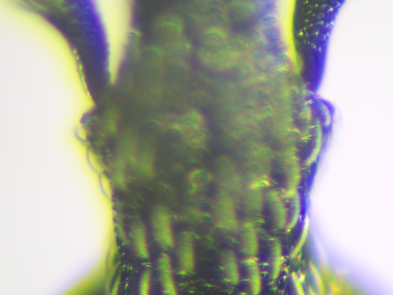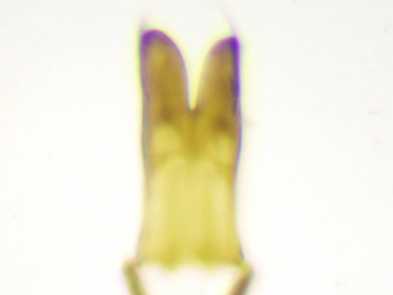 However, there were two problems with calling it carduorum. Firstly it was a touch under 2.6mm long, whereas the bottom end of the size range for carduorum given in both keys is 2.7mm. Close enough maybe? Secondly Duff describes the elytra as "bright metallic blue", whereas gibbirostre can be blue or green. This was clearly green - bluish green maybe, but more green than blue. This seemed less of a problem when I looked at photos of carduorum online - they all seemed pretty green to me, although not as green as mine. So, though I retained a niggling doubt, the shape of the rostral swelling seemed pretty unambiguously round, it surely had to be carduorum. To remove the niggling doubts I decided to check the genitalia. Duff doesn't show the genitalia and Hackston only uses genitalia to compare onopordi to the other species, not do differentiate between the other species whose genitalia aren't illustrated. But there are photos of gibbirostre genitalia at coleonet.de and the Weevils of Greece website. The latter also has genitalia photos for the non-UK Ceratapion damryi but I cannot find any photos of carduorum genitalia. Still, if the genitalia were clearly different from gibbirostre, that would probably be sufficient to convince me it was carduorum. Well, looking at the Weevils of Greece website first, it was different - the V incision of the tegmen diverged more widely near the point of the incision, and the inner sclerite seemed narrower with fewer teeth along its side. The latter difference was less convincing when I looked at the coleonet.de photos but the V still looked wider at the incision. However I then set the genitalia on a microscope slide and as I compressed the tegmen slightly while putting the cover slip on, it splayed out so that it now looked much more like the photo at the Weevils of Greece site.