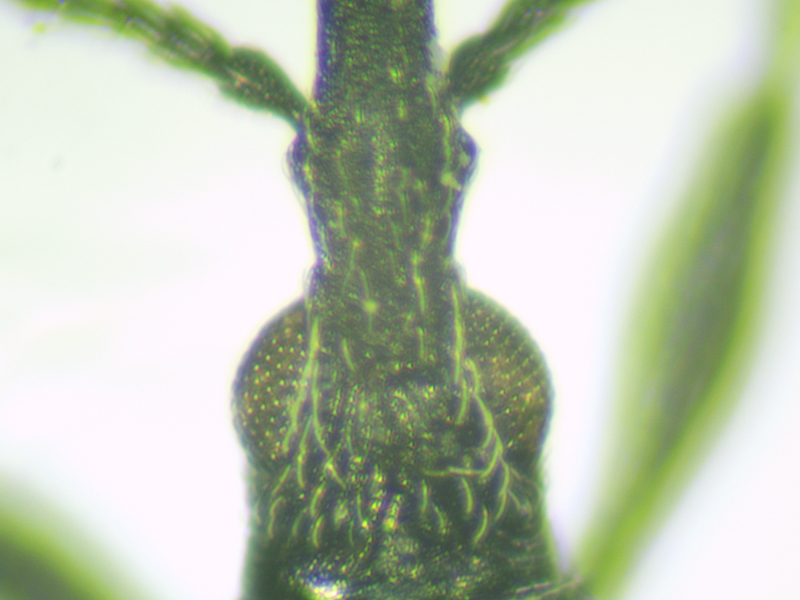 This came to light in 2022 and although it predated the ones above, I examined it afterwards. At first I was unsure if this one was onopordi or not as whilst the frons seemed more-or-less similar to the ones above, and the pronotum was strongly punctured, the gaps between the punctures on the pronotum were noticeably larger, the punctures themselves being slightly smaller. The rostral teeth weren't as angled as shown in Duff for gobbirostre, so if it wasn't onopordi then it would have to be carduorum, but at barely over 2.5mm it was small for that species. The rostral teeth (or bulge) seemed more than shown for onopordi, closer to that of carduorum, and this added to the difference in pronotal punctures was starting to tip the balance more towards carduorum, although I remained unconvinced given the similarity in the frons and only minor difference in pronotal punctures. I then found that in photos of gibborostre the rostral teeth were not as pointed as shown in Duff which, in view of the size, made me wonder if it could even be that.