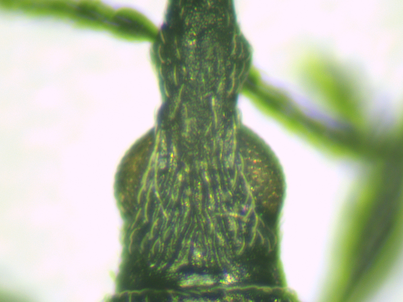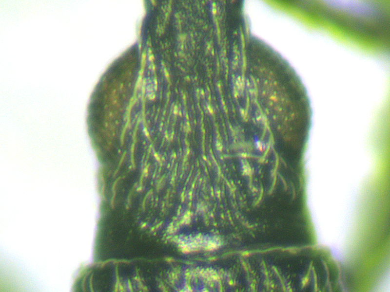 Now rather confused, I turned to another Ceratapion from 2025 that was also waiting to be identified. This one had a clearly different frons pattern, the ridges being much finer and more parallel. The punctures on the pronotum were far shallower - rather hard to see at all. The differences between 2025 and 2022 individuals was vastly greater than the difference between the 2025 indidvidual and the onopordi shown above, and this reassured me that onopordi must be the correct identification for the 2022 individual. I had hoped to confirm this genitalically, but on dissection it proved to be a female. It was fully-winged (although Duff says that both onopordi and armatum have fully-winged and short-winged forms, it omits to say whether carduorum and gibbirostre have either or both).