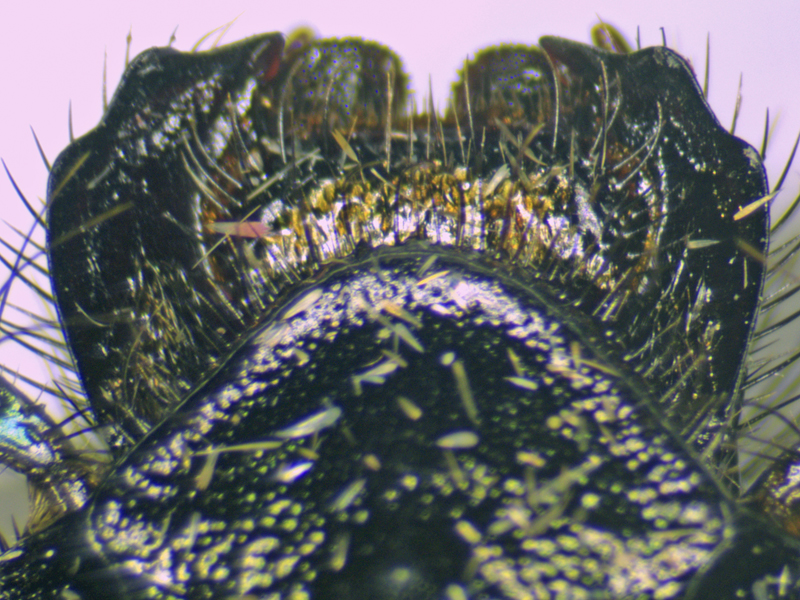 I didn't find this particularly easy to identify, though I think that probably came down to inexperience with the family rather than it being truly difficult. I used a combination of Duff, Hackston and the John Walters PDF and in the end I was happy that everything checked out for spiniger. I used Duff first: the hind tibial keels were easy enough to see if you hold the tibia at the right angle, although as my specimen was covered in dust I had to clean it a bit first. The mandibles were more sinuate, or bumpy, than shown in the diagram in Duff for spiniger (so clearly much more so than stercorarius which at this point was the only alternative remaining). I was also slightly confused by the statement that male spiniger had a ventral tooth on the hind femora whereas female didn't - this appeared to have two teeth! I wasn't quite sure if the distribution of hairs on the sternites was right either - the centre line was bare but fairly narrowly, whereas I thought Duff was perhaps implying they should be restricted to the sides.