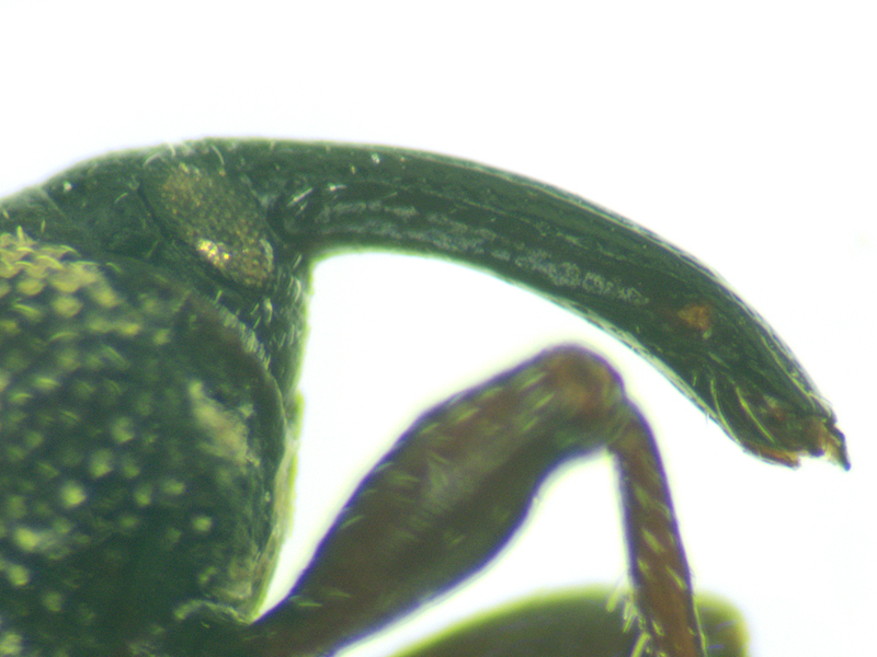 Notaris acridulus showing rear side of elytron, rostrum from side, fore tibia and pronotum, North Elmham (Norfolk, UK), 14th October 2017