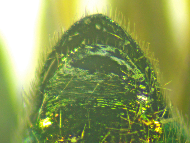 female Swollen thighed Beetle Oedemera nobilis showing apical sternite (and tip of tergite behind this), Wendling Beck Environment Project (Norfolk, UK), 20th August 2025
