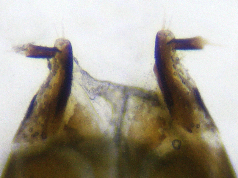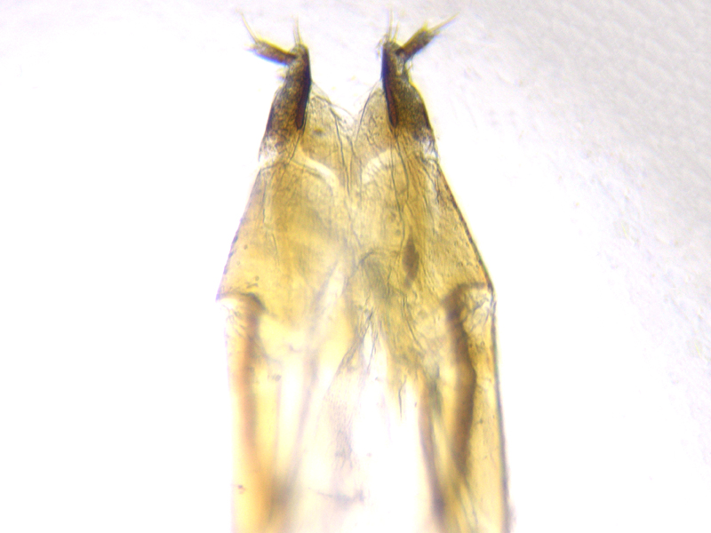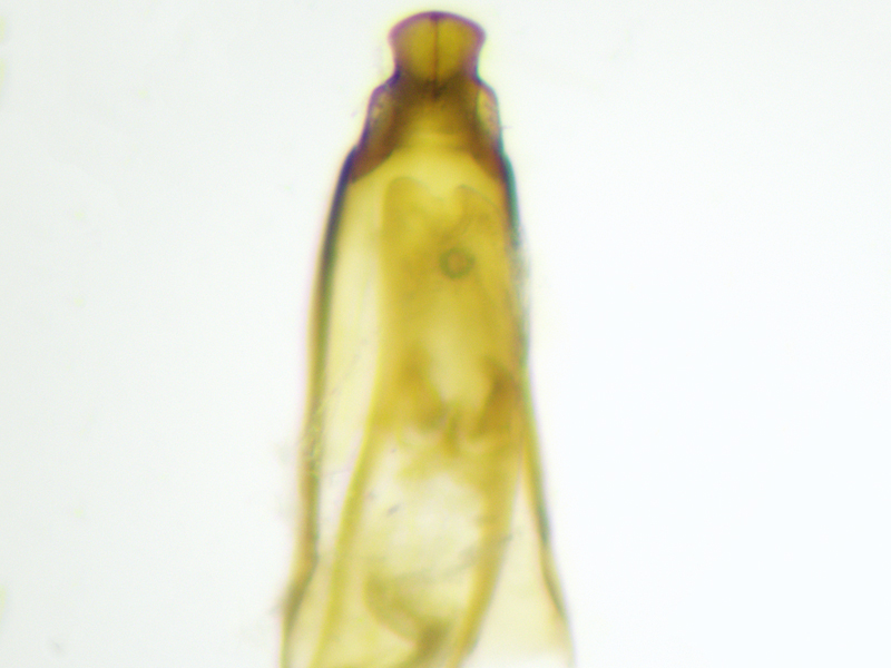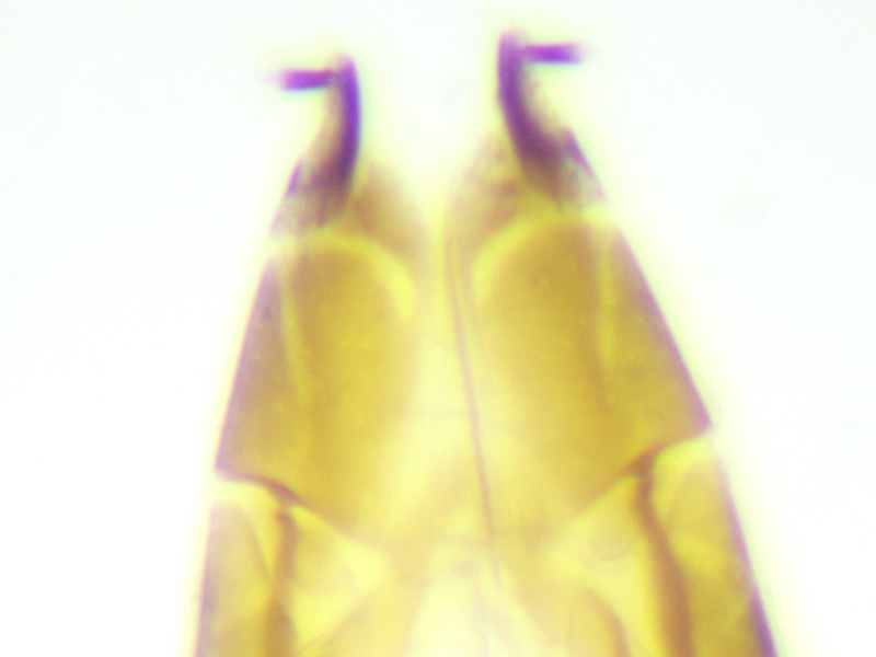 female Olibrus aeneus showing elytral apices and gonocoxa, Wendling Beck Environment Project, 4th March 2025