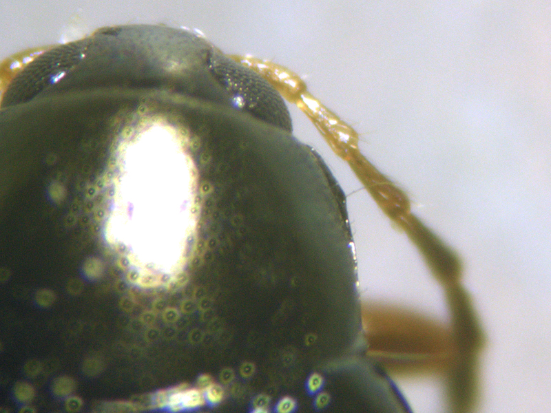 Cabbage-stem Flea Beetle Psylliodes chrysocephala showing hind tarsus, pronotum and elytral epipleuron, North Elmham (Norfolk, UK), 19th March 2021