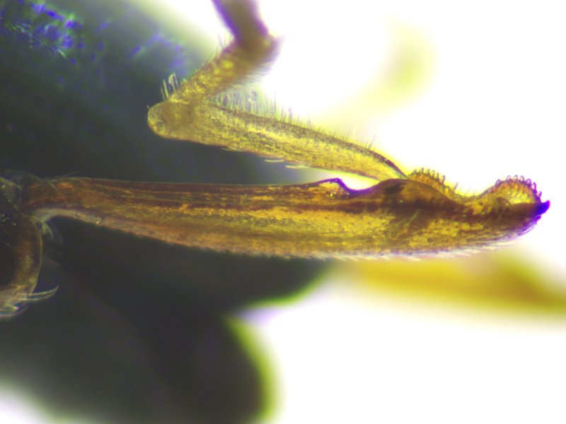 female Cabbage-stem Flea Beetle Psylliodes chrysocephala showing hind tibia and spermatheca, North Elmham Cathedral Meadows (Norfolk, UK), 17th September 2021