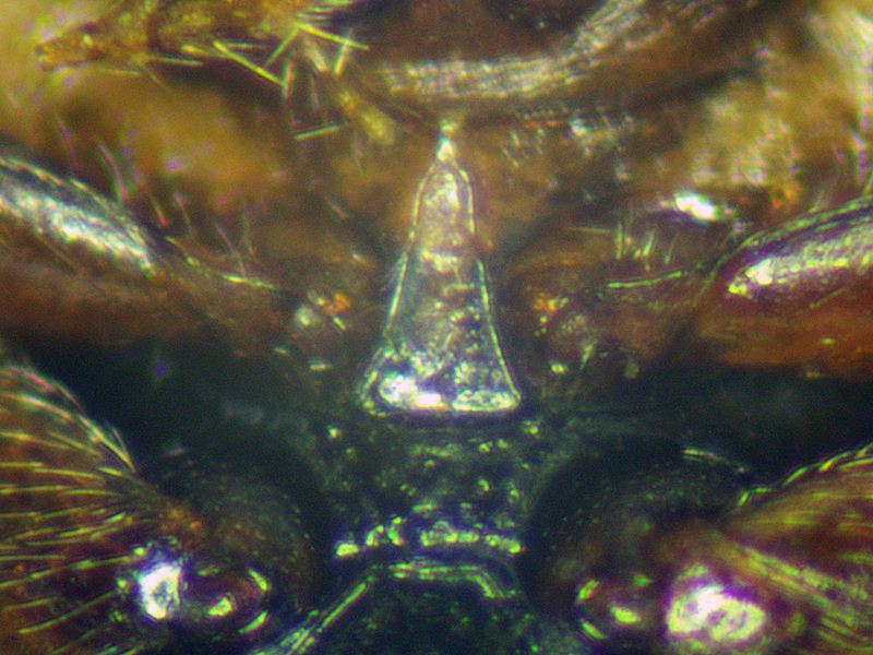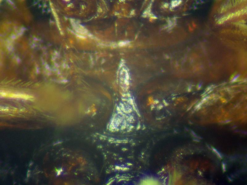 My next two were found by suction. Neither had a horseshoe mark on the elytra but both had a dark spot on the join of the elytra towards the apex. On this one this spot was shaped rather like an écaille (fish scale) tile (in fact, looking at my photos, it seems there is a trace of the horseshoe emerging from the sides of this mark which wasn't apparent looking at the specimen).