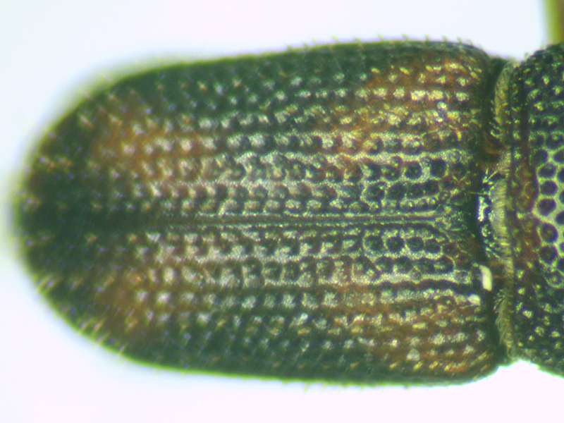 I found this indoors, in my bathroom. Duff's key separates this species from Maize Weevil Sitophilus zeamais (which I don't think has been recorded in Norfolk) by male genitalia and although the species notes suggest zeamais tends to be darker brown, more shining and with finer microsculpture on the upperparts, he says that only males are safely separable. Mike Hackston's key says that the pronotum of oryzae has "an indication of a median line which is either free of punctures or marked by two regular rows of punctures." On mine the central punctures are arranged more-or-less linearly so that there is a puncture-free line through the middle of the disc (not to the front and rear margins) which I guess is compatible with this? It also says the second segment of the flagellum should be scarcely longer than wide vs. 1.5x as long as broad on zeamais. I think mine is in between.