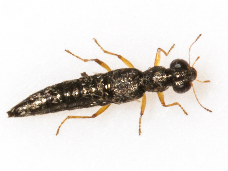 female Stenus aceris showing head & pronotum, antannae & palps, basal abdominal tergites, hind leg and hind tarsi, North Elmham (Norfolk, UK), 23rd March 2022