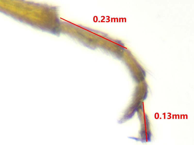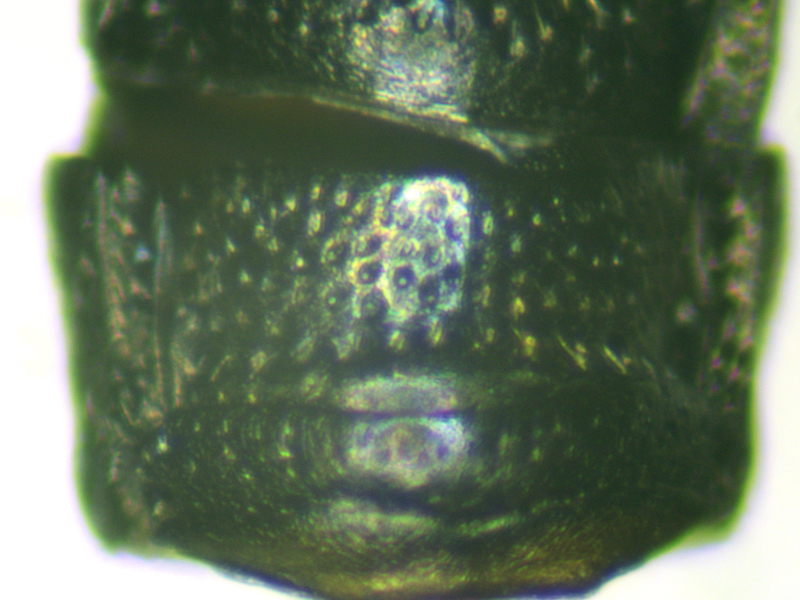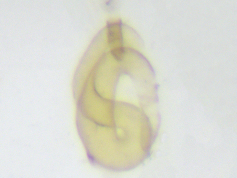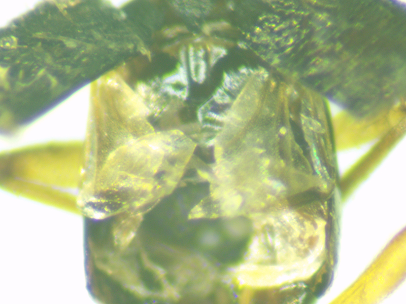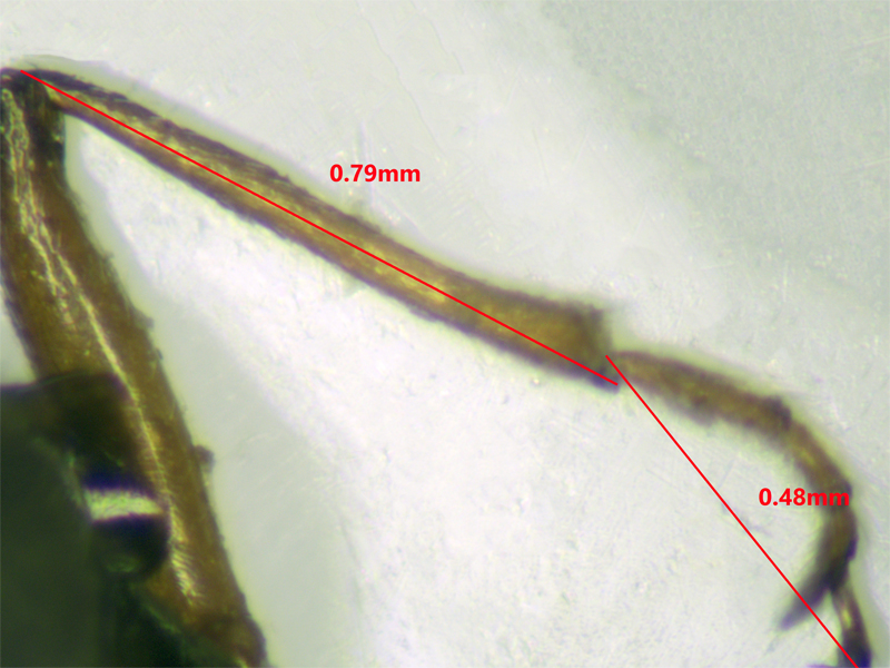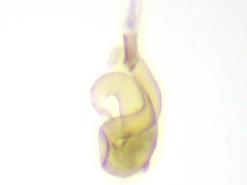 This was found by suction and was another female. There was some microsculpture visible on the first visible sternite but this was very weak. Another point in favour of aceris rather than impressus was the wings which were full - apparently impressus is usually short-winged, although "usually" implies some are full-winged. I don't have any references that show the spermathacae for most Stenus species so I don't know how helpful this might be, but I photographed it anyway in case it might be useful. I'd done so for the impressus I found previously and that looked quite different - but both were apparently different from a very poor photo of impressus spermatheca at coleonet.de.