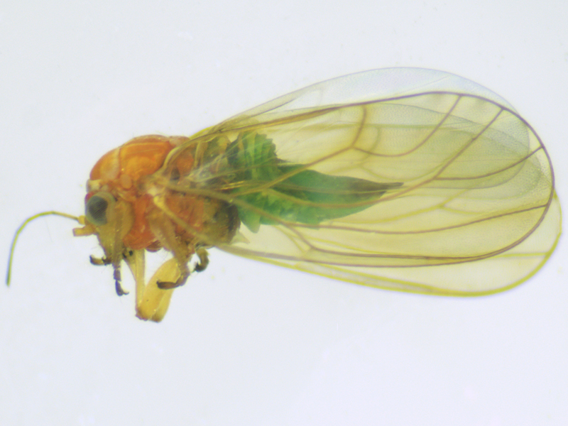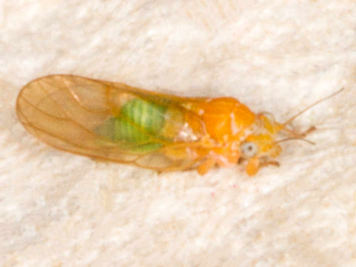 This came to light in my garden. It struck me as being quite different to the numerous Cacopsylla melanoneura which I have caught here previously, most obviously due to the very strong yellow suffusion on its forewings. I have observed some variation in the degree of suffusion (or lack thereof) on melanoneura but I have never caught one approaching this before. The entire insect seemed brighter and cleaner than is usual on melanoneura too, although there is much variation in melanoneura body colour and some certainly approach this (and nothing I've read suggests that colouration is helpful for separating these two species). Using the RES key, this keys straightforwardly and clearly to Cacopsylla affinis (or rather Psylla subferrugineus, the name that key uses for this species), and I suspect that this may well be the correct identification. However, other sources (including the British Bugs websitse and James Emerson's excellent NNNS guide to the Psyllids of Norfolk) state that melanoneura and affinis can only be reliably separated by male genitalia. Sadly this one was a female, so I guess that means that I cannot exclude the possibilty that it was an extreme melanoneura and therefore cannot record it as a certain affinis.