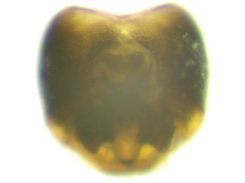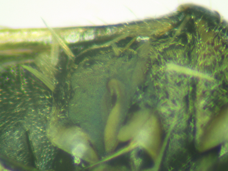 At this point I started to suspect that it was in fact huttoni despite the very short hairs on the clavus, but I could not - and still cannot - find any references which show the shape of the aperture for huttoni so I could not confirm that this matched. By now I had already discarded the above specimen without sexing it, but keen to compare the genital capsule with a male huttoni I sifted through my discard pot and retrieved it, only to find that it was a female. However, in other respects, such as the form of the bucculae, metapleura and antennae, it was basically identical. Moreover, although the majority of the hairs on the clavus were very short, there were some long ones around the edge and elsewhere (especially on the pronotum). So in the end I'm happy it was huttoni, though I shall try to remember to find out what the genital capsule is like next time I find a normal male.