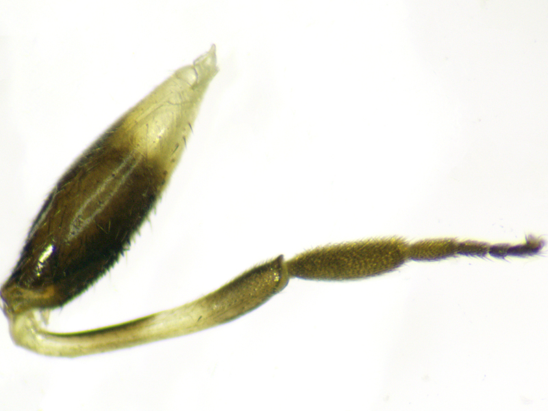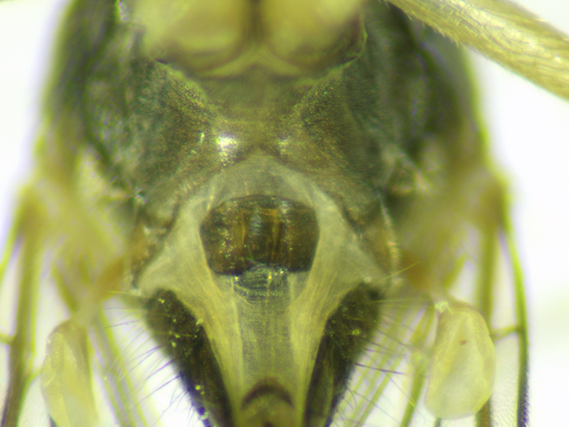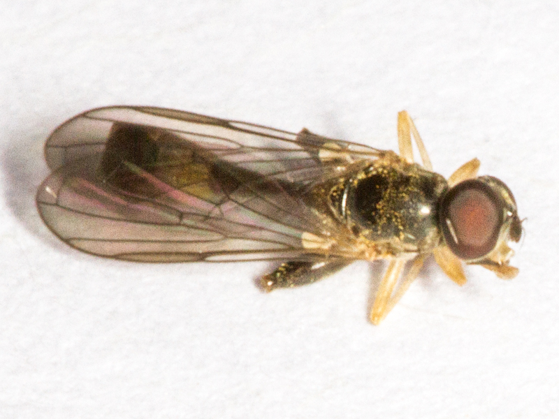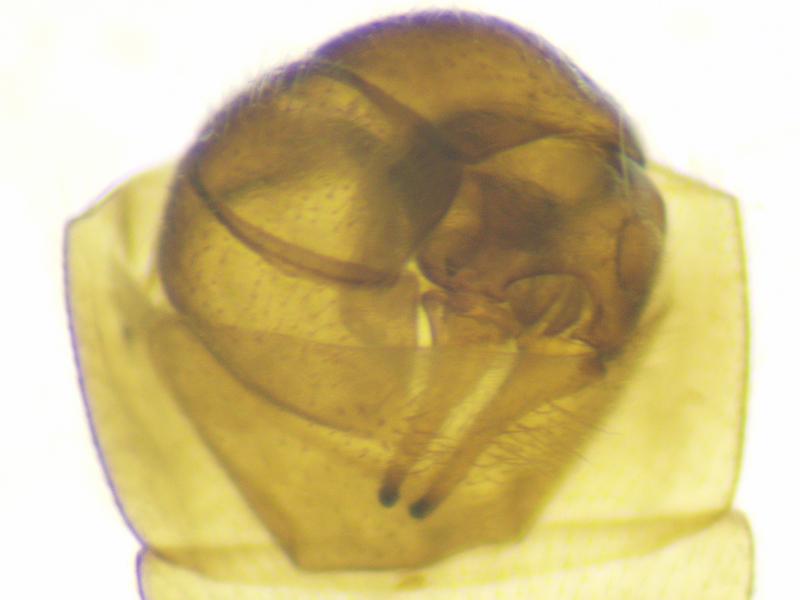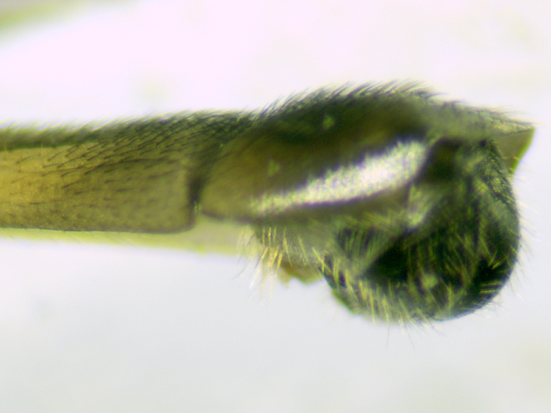 This was swept from Hemp-nettle and Common Nettle. My visit was not primarily for surveying and I forgot I'd collected a few insects when I got home so didn't get round to photographing them until they'd died. I initially assumed this was a female given the separation between the eyes but when I saw the shape of the abdomen tip I realised this must be one of those hoverflies where the males' eyes aren't close together. The specimen was dried out when I examined it and I could not see the processes on the genitalia which, according to Ball & Morris, suggested that it might not be clunipes. However, I was aware that such detail can be hard to see on dried specimens so referred to Stubbs & Falk for more detail. The key there didn't require visiblility of the genitalia (or even sexing it) and it keyed to clunipes reasonably straightforwardly. The only slight hesitation was with the colour of the face as the yellow wasn't very obvious - rather dark (not really whitish-yellow) and partly obscured by the silvery hairs. However it was yellow, and may have darkened after death. Just to make absolutely sure I cleared the abdomen to see the processes. I could see the processes from below but even after clearing they were still not exposed in side view until I prised it open.