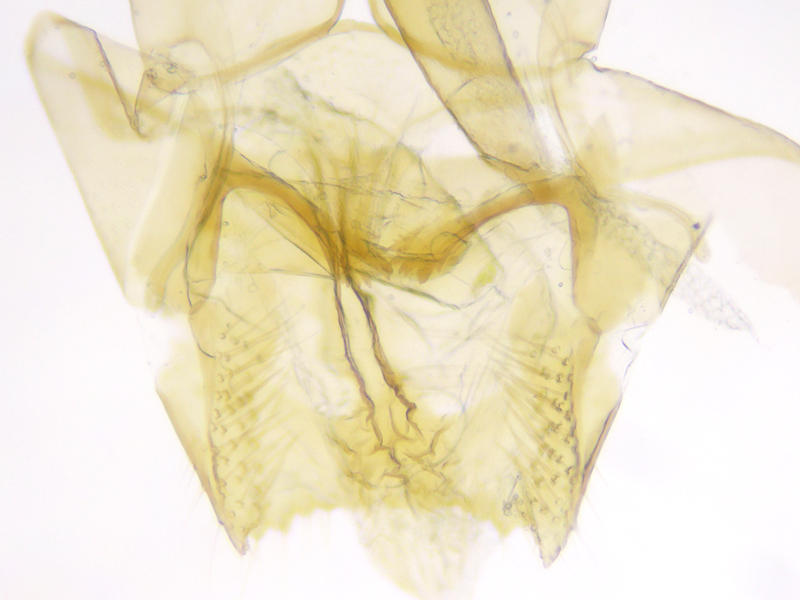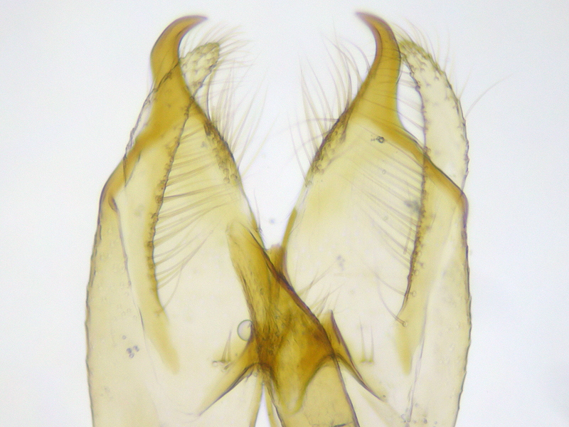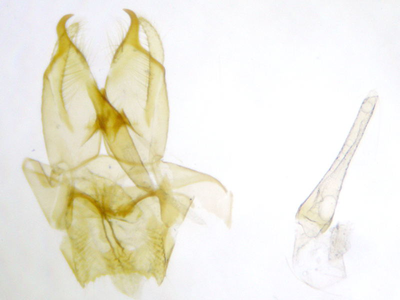 This moth was caught by Laura King in her garden. Laura sent me a photo for ID and I suggested that it be dissected to confirm the ID. She duly passed it on to me and the genitalia prove that it was variatella. Note that my attempt to detach the aedeagus resulted in it breaking so only part of this is shown to the right of the rest of the genitalia below, the rest remaining attached.